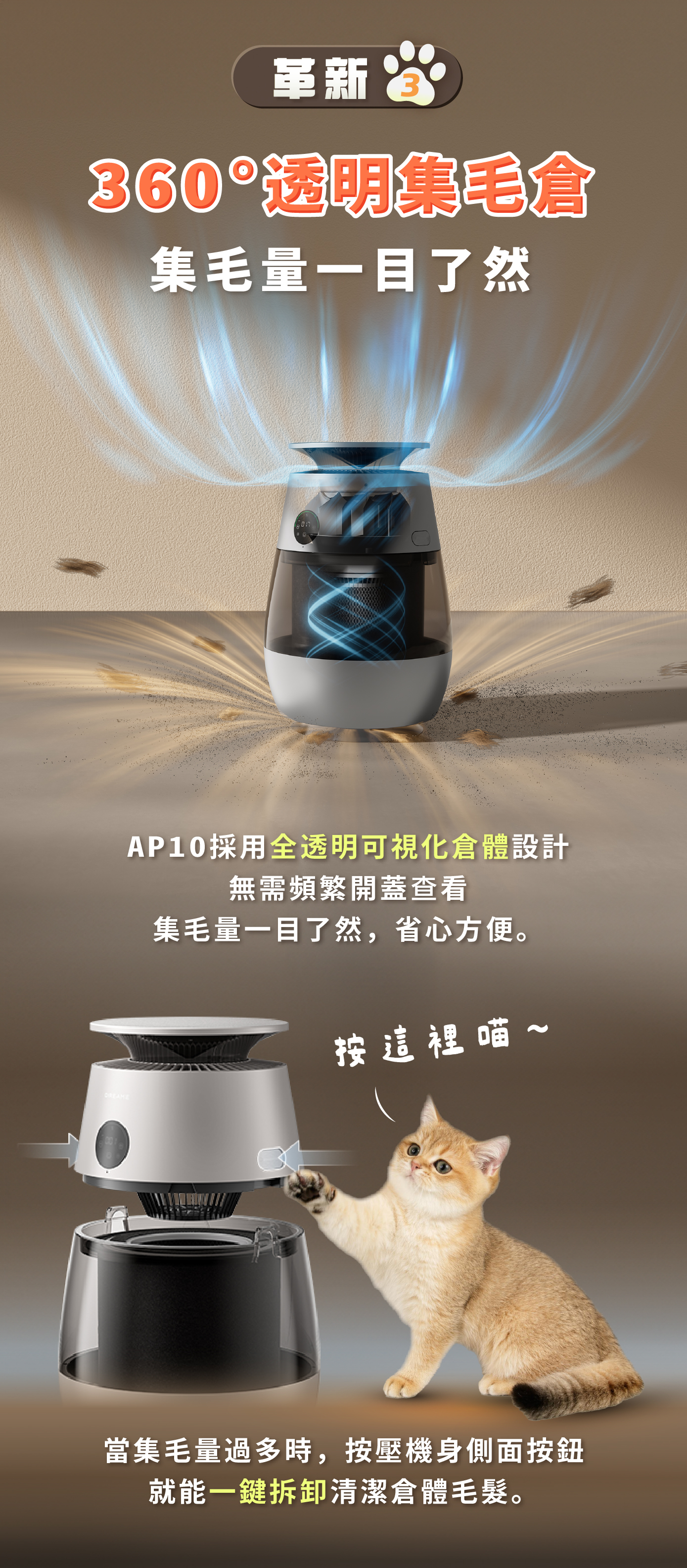 2️⃣ 360°透明可視集毛倉|大容量集毛,一鍵拆洗超方便