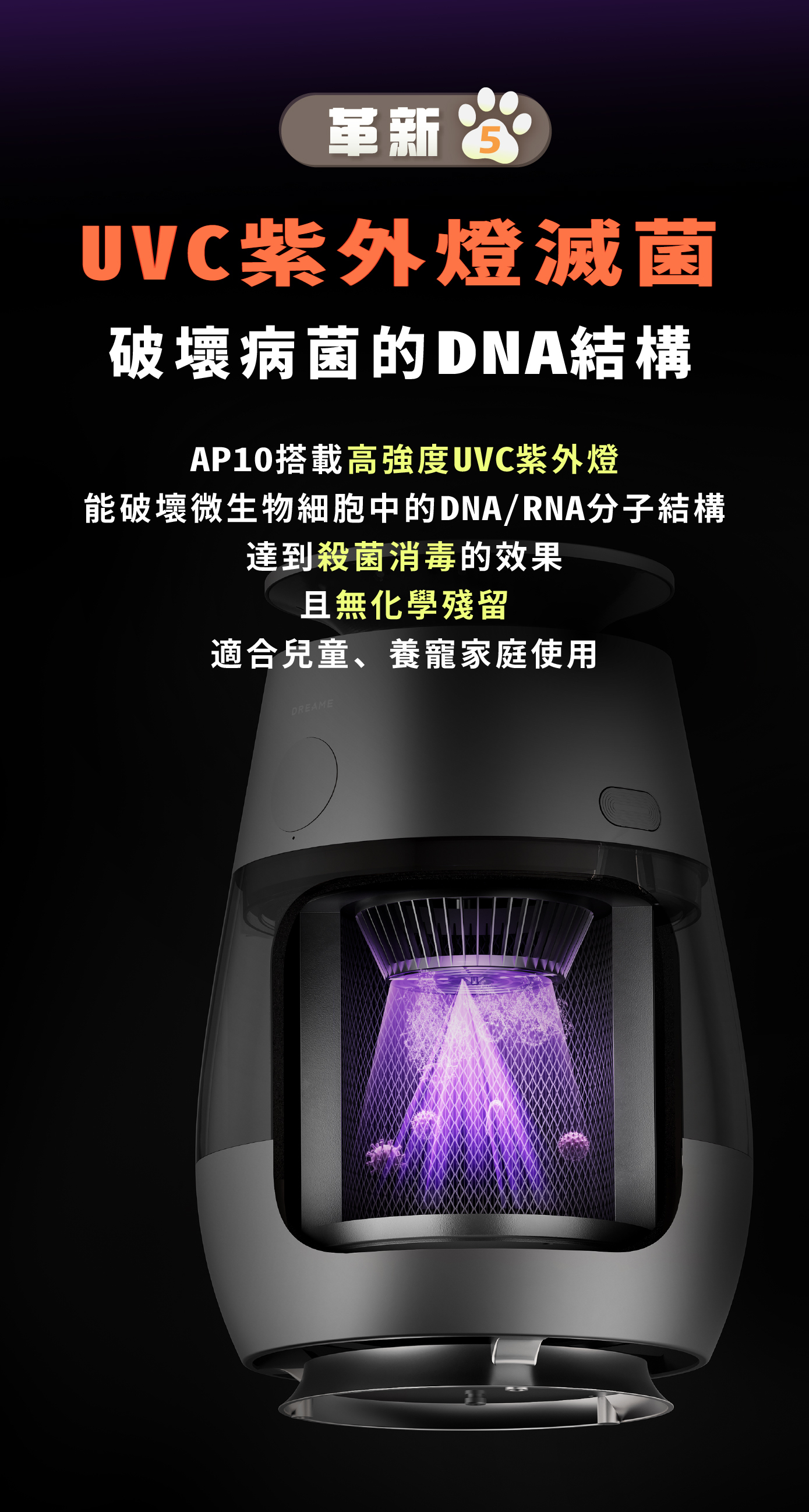 4️⃣ 雙重除菌系統|UVC紫外燈+負離子技術,進一步淨化