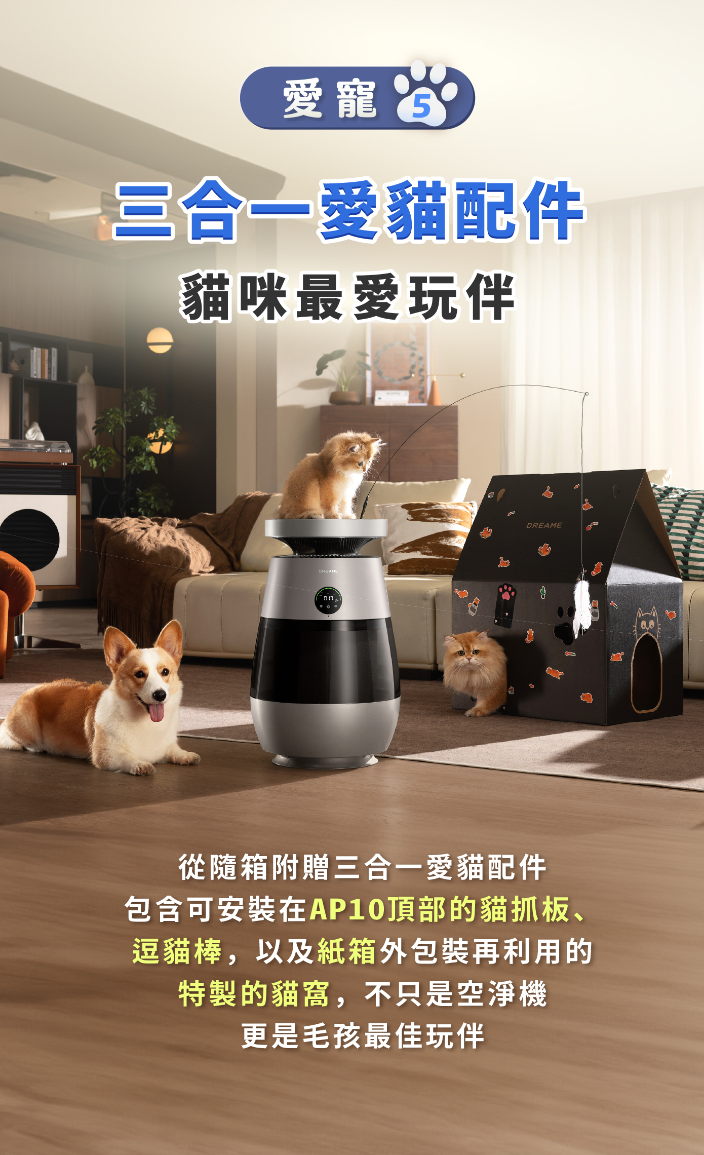 5️⃣ 五合一寵愛毛孩|專屬座位+雷射紅點+貓抓板+逗貓棒+貓窩