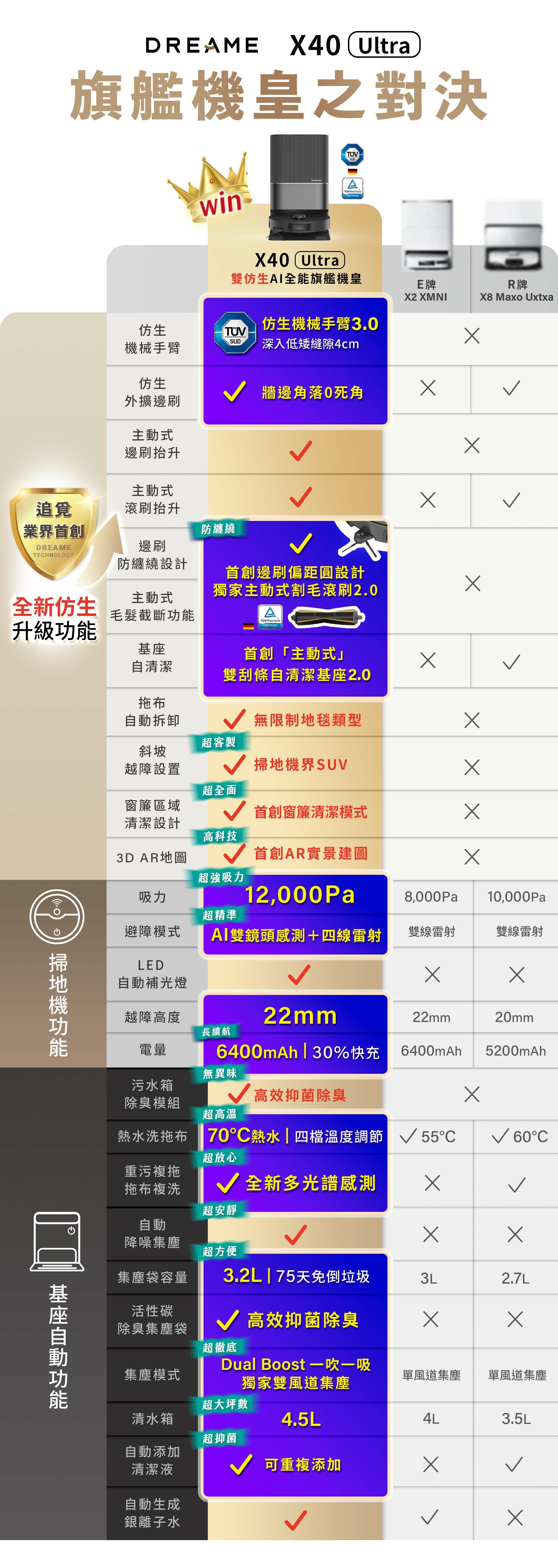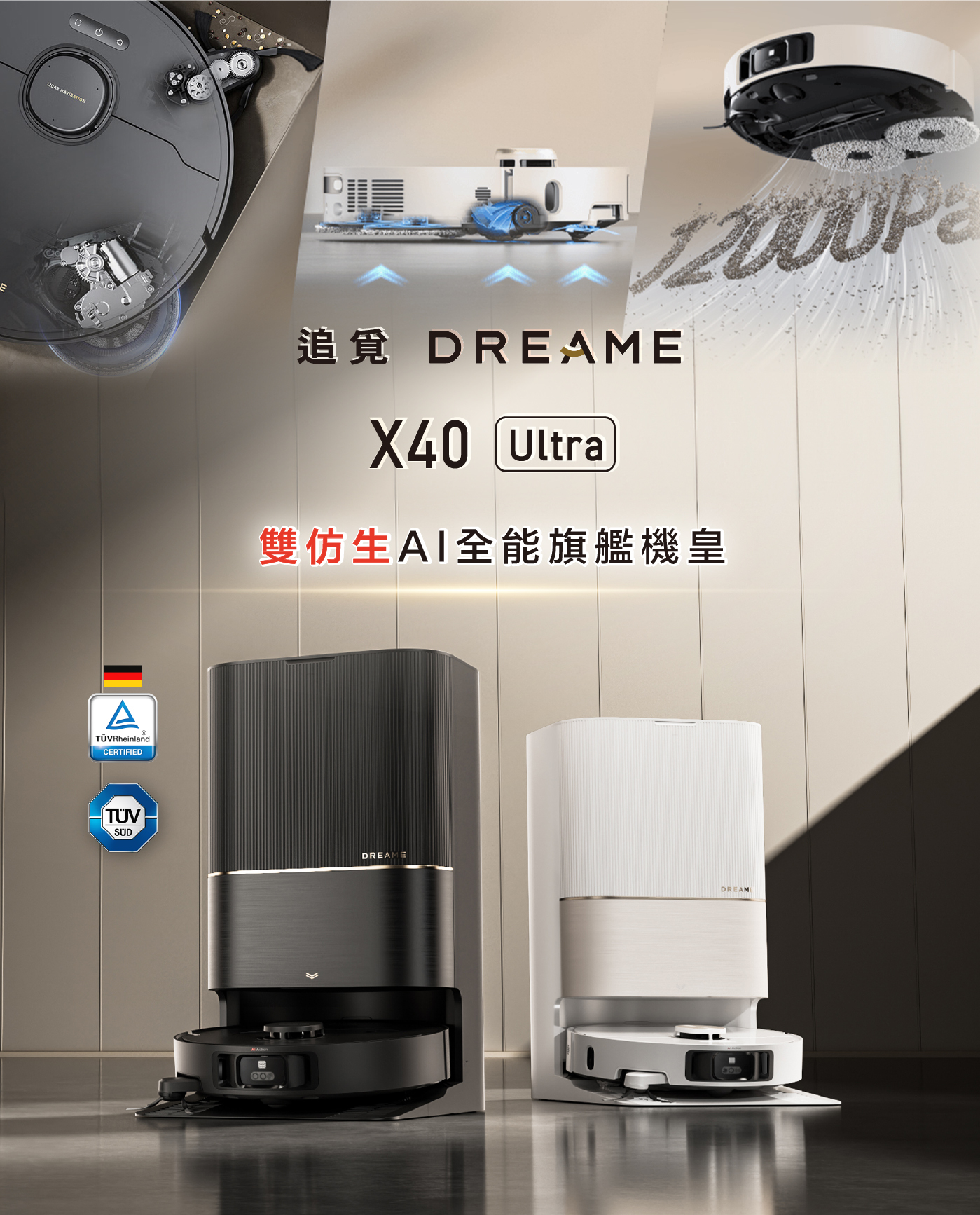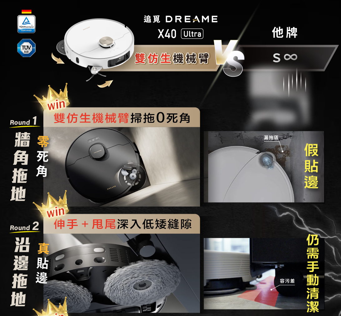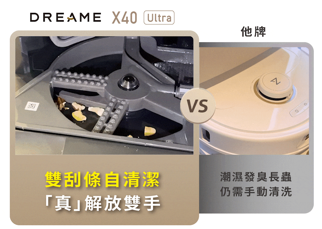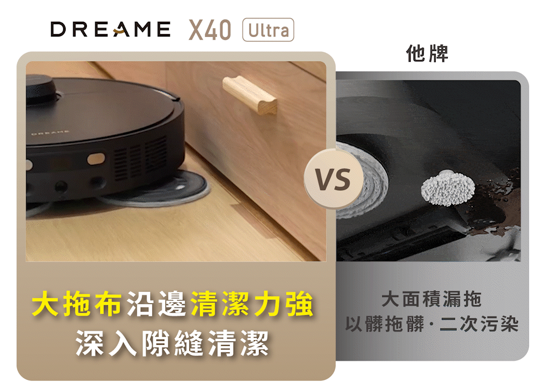 追覓X40 Ultra是業界唯一達到「邊刷」+「滾刷」+「拖布」三重抬升的機型,可以達到「真」乾濕分離,避免二次污染。