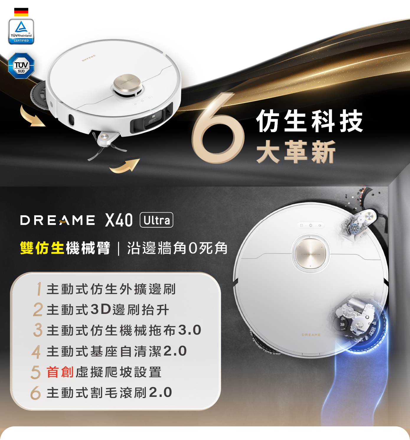 X40 Ultra搭載全新仿生機械邊刷,模仿真人清掃角落,遇到邊角自動外擴,牆角無需再動手補掃,過往的清潔死角不復存在。