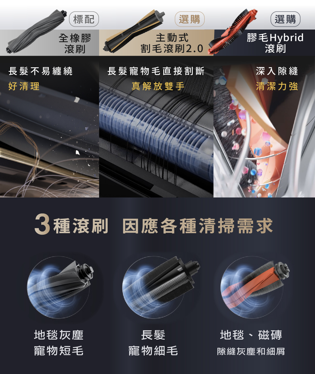 追覓首創割毛滾刷2.0,搭載梳齒安全刀片,把利刃完全包覆在內,不傷地毯不傷手。並加上V型防靜電材質膠條,以及黃金50°角傾斜設計,能夠更高效收集灰塵顆粒不遺漏。