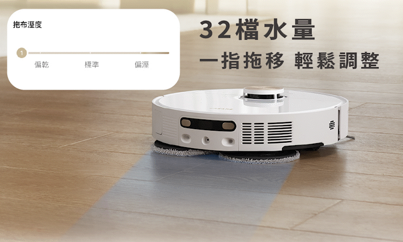 X40 Ultra拖地水量客製化,由原本的3檔升級至32檔,不論是適合較大水量的砂石地板,或是適合低水量的木質地板,都可以自由調整至最適合家中的水量設定。