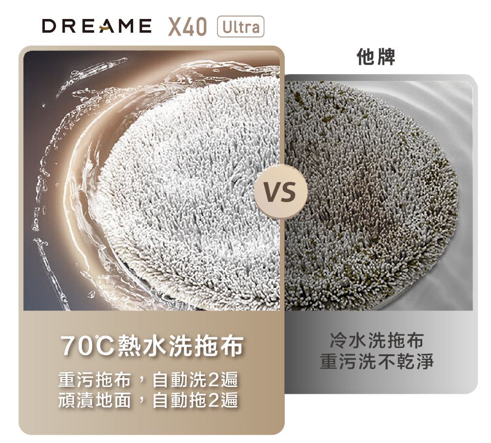 X40 Ultra可使用四檔溫度來清洗拖布,最高可達70°C熱水深度除菌清潔,除了除菌之外,還能溶解污漬,就算遇到頑強的廚房地板,也不用擔心!