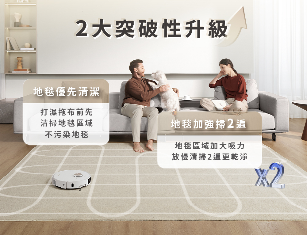 X40 Ultra具有業界最大的12,000Pa吸力,搭配獨家主動式割毛滾刷2.0,不論是灰塵、顆粒、螺絲釘,或是難纏的毛髮,都可以一次通通吸入集塵盒。當偵測到地毯,也會自動增加吸力並降低運行速度,讓各種灰塵、顆粒無所遁形。