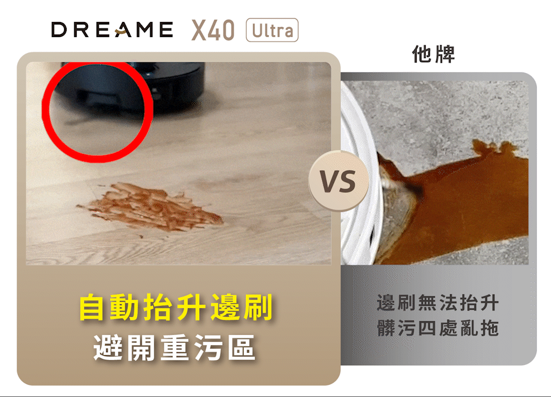X40 Ultra是業界第一台能主動識別污漬的掃地機,當RGB鏡頭識別到如醬油等重污,邊刷、滾刷將會自動抬升,並放慢速度精拖。這樣一來,不僅能增加清潔強度,也不會造成二次污染。