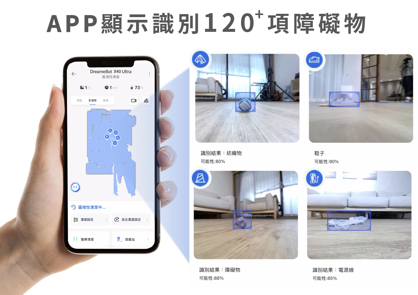 X40 Ultra搭載RGB+紅外線雙鏡頭,精準辨識超過80種障礙物,除了心愛的家具之外,電線、拖鞋、玩具也絕不碰撞,甚至還能當作行走的監視器使用。