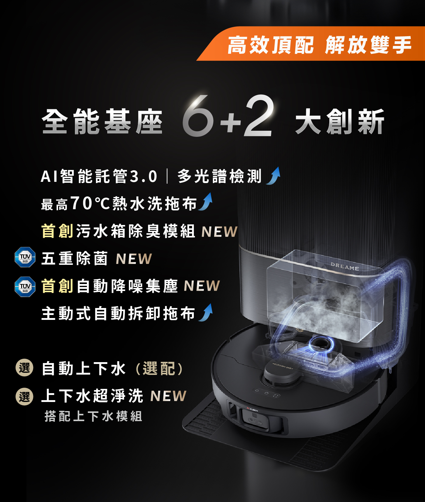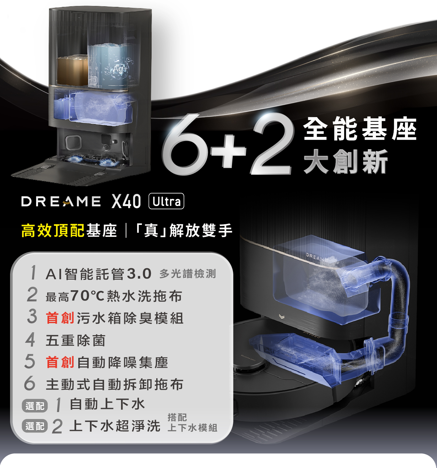 X40 Ultra 基座可以升級自動換水功能,只需加裝自動上下水模組,就能像洗衣機一樣,自動添加清水、排出污水,解放雙手又更向前了一步。