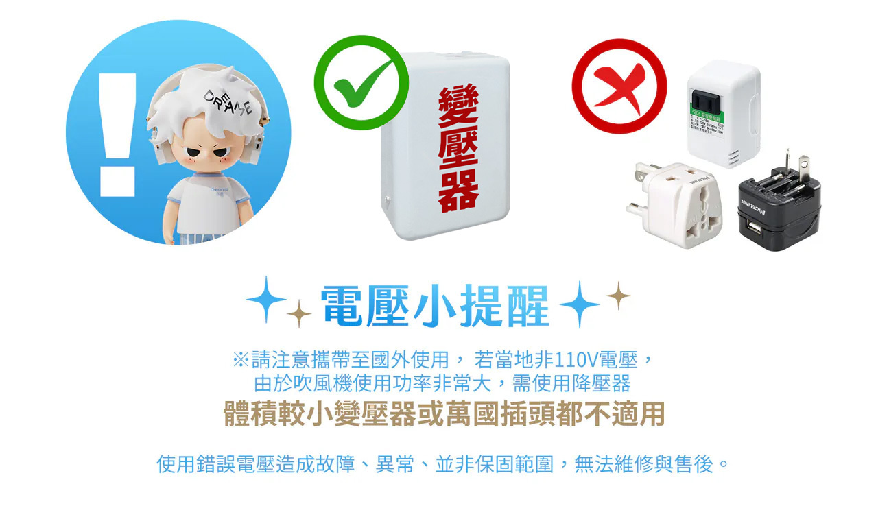 請注意:本產品僅適用110V以下電壓,因電壓不符而故障、毀損,不在保固範圍中。