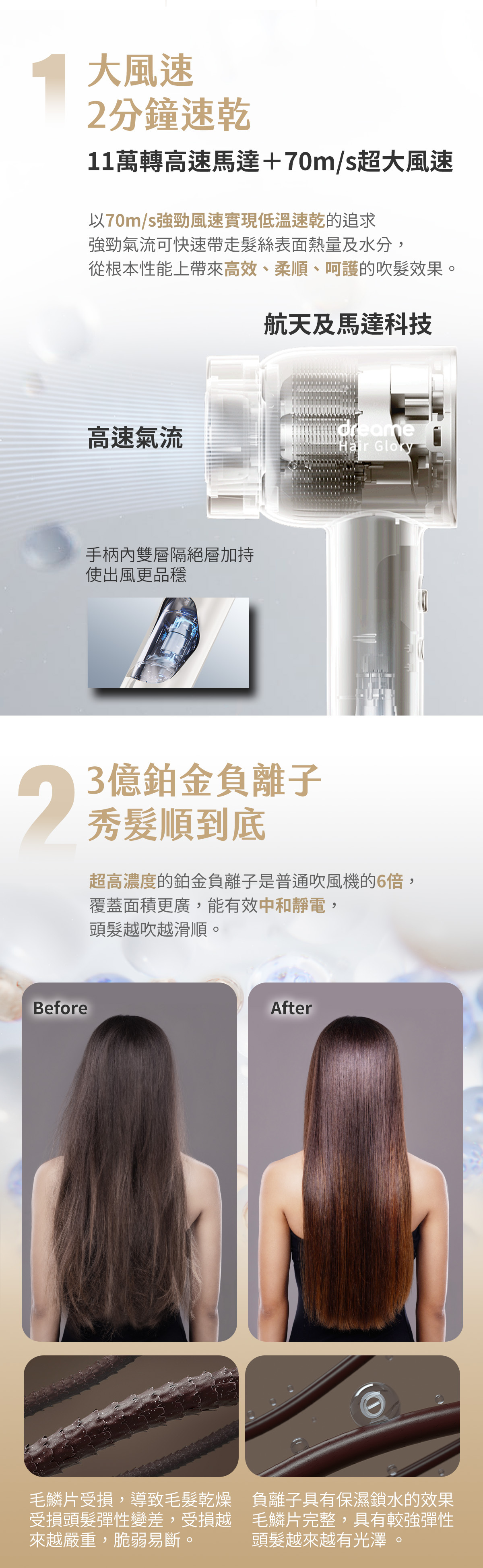 ➤ 3億鉑金負離子|有助於撫平毛躁、鎖住髮絲水分,秀髮順滑飄逸
