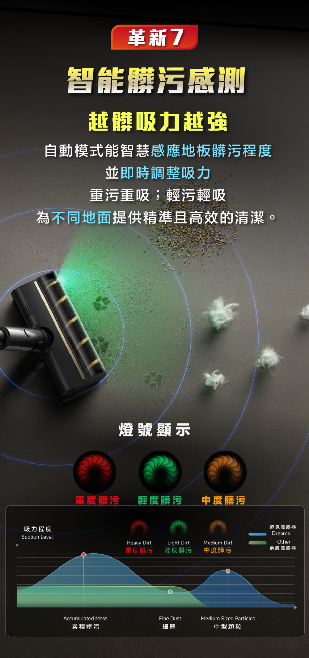 智能髒污感測|自動偵測髒污程度,調節吸力,越髒吸力越強