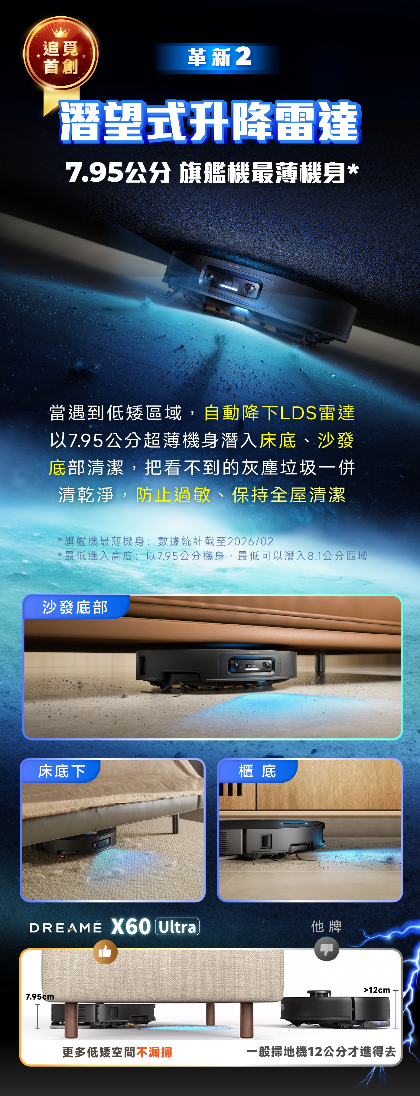 2️⃣ 以 7.95cm厚度 潛入床底和沙發清潔 不漏掃