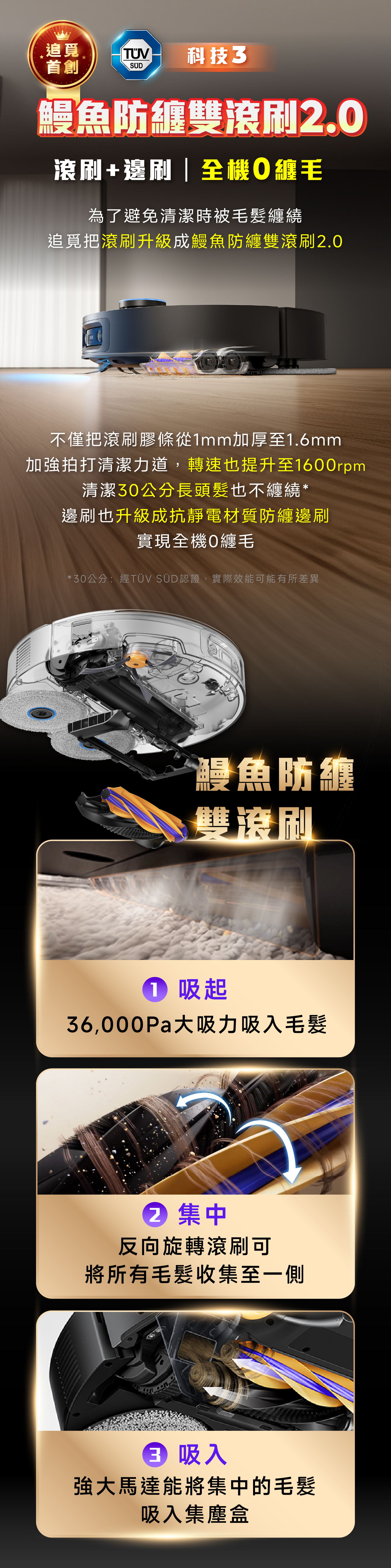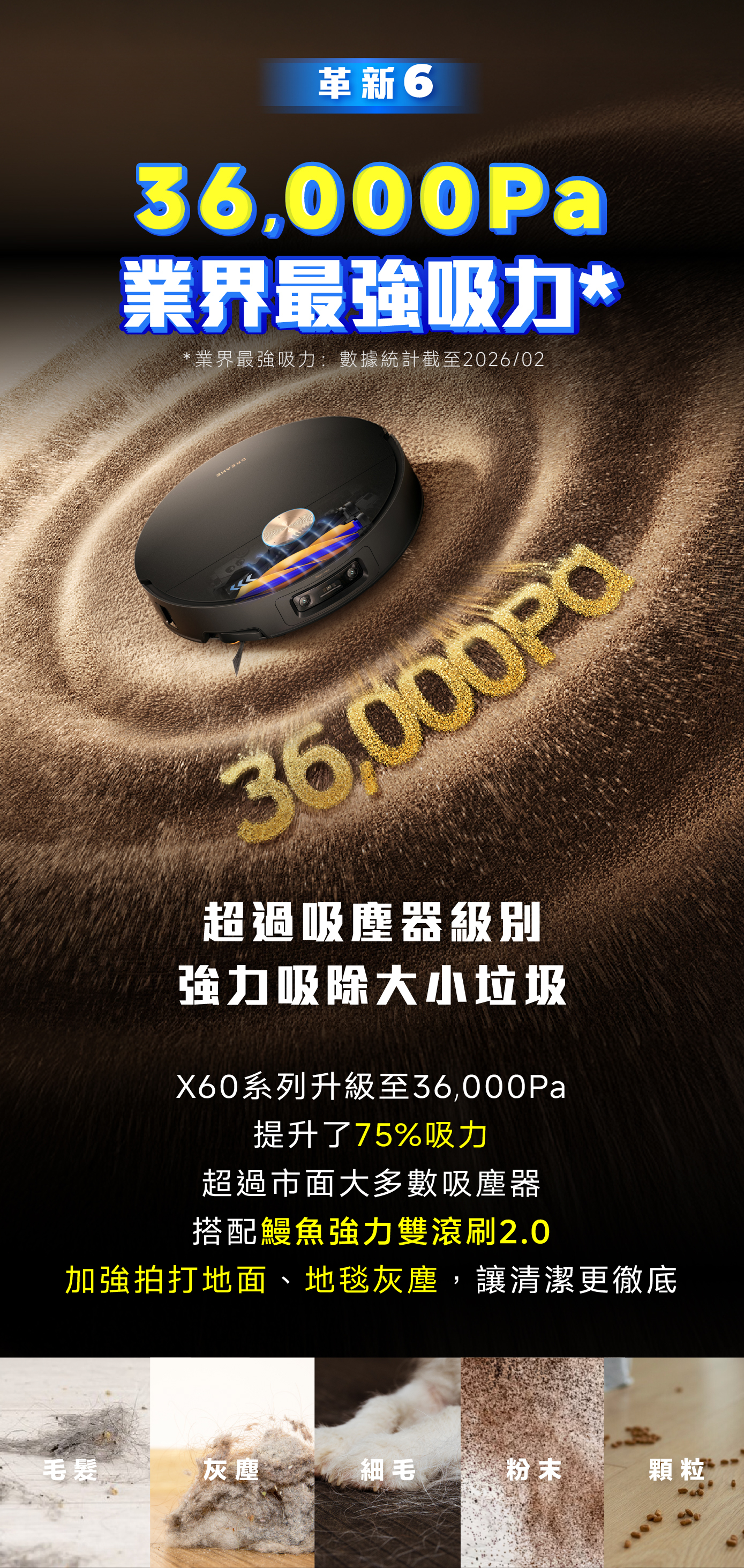 6️⃣ 36,000Pa颶風吸力 清潔顆粒灰塵 無懼毛髮纏繞