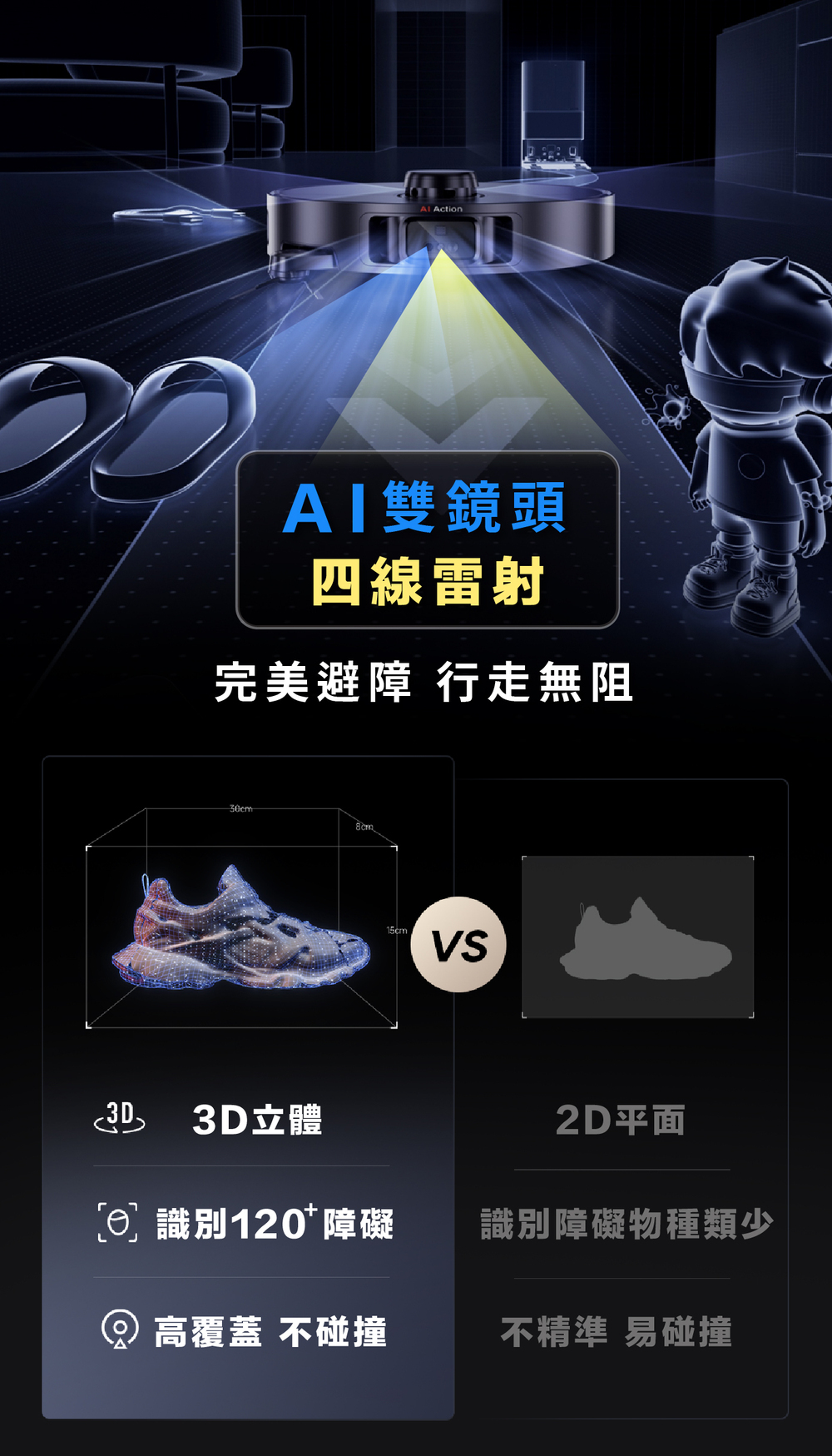 ✔ 超精準|AI雙鏡頭感測+四線雷射+LED夜視補光燈・辨識120種障礙物