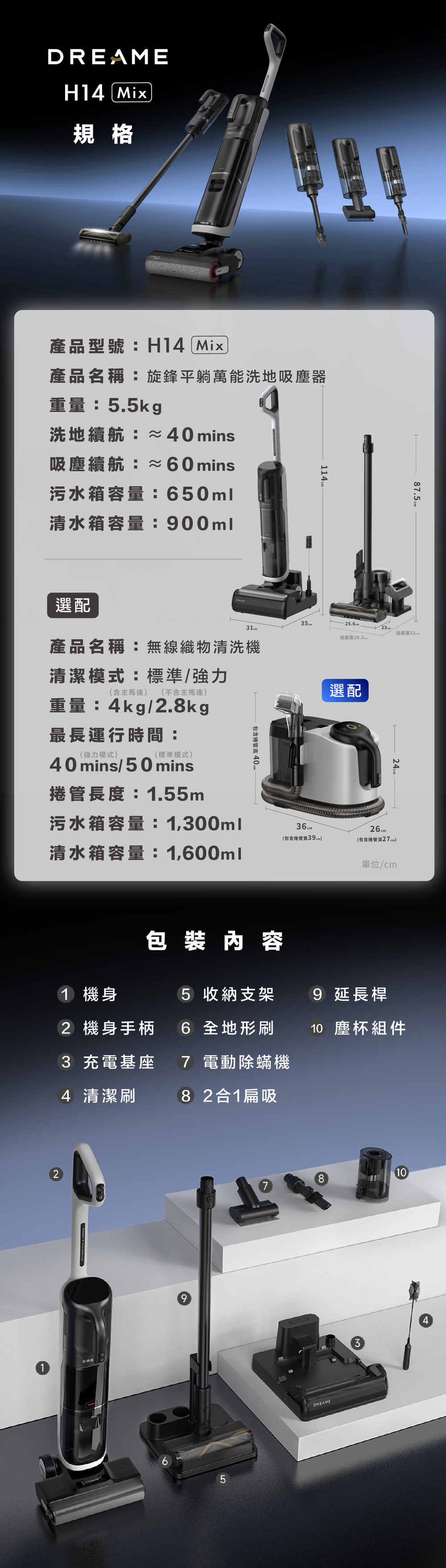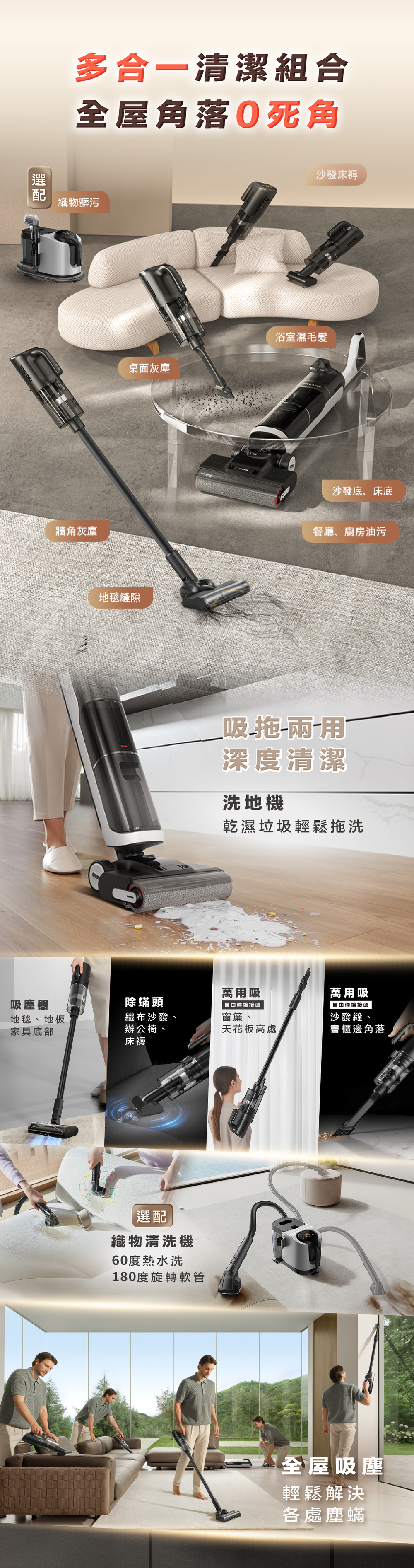✔ 一機五用:洗地機+吸塵器+除蟎機+萬用吸+織物清洗機(選配)